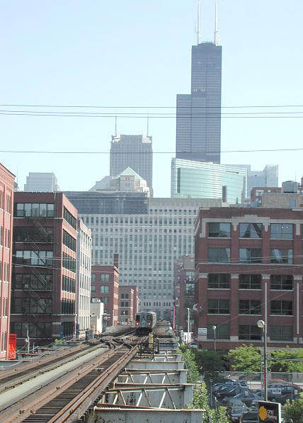 From a bit further out than the previous image in the section, this view looks south from the Chicago Ave. station. The then-named Sears Tower (now Willis Tower) rises high in the distance. A train heads away from the station, and toward the Loop.