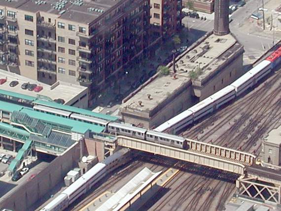 surroundings as seen from the observatory high upon what was then the Sears Tower. A short Green Line "L" train destined for Harlem/Lake