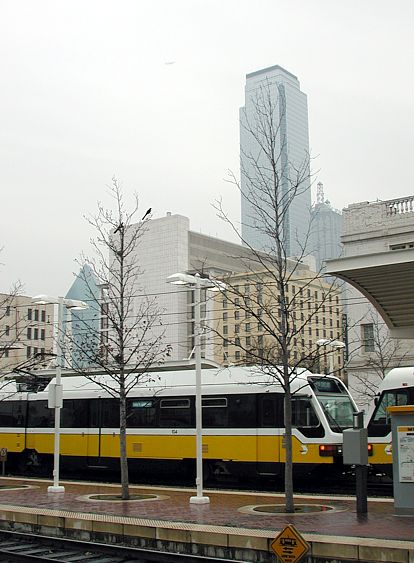 Part of the downtown skyline appears behind DART and a corner of Union Station. The rail station has been nicely restored as a transit hub, but it is often eerily empty inside.