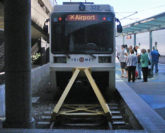 A train in the 300 series had just arrived at Portland International on the single track, and passengers were still waiting to board. This is the end of the line for the Red Line, and the bumper makes sure there is no mistaking that fact.