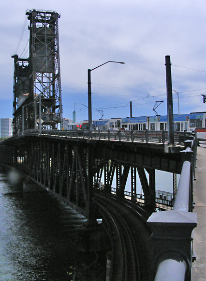 This view again returns to an image of the bridge with both levels of rail traffic showing. Two trains and a TriMet bus appear on the upper level. Only shining rails -- with no traffic -- appear below.