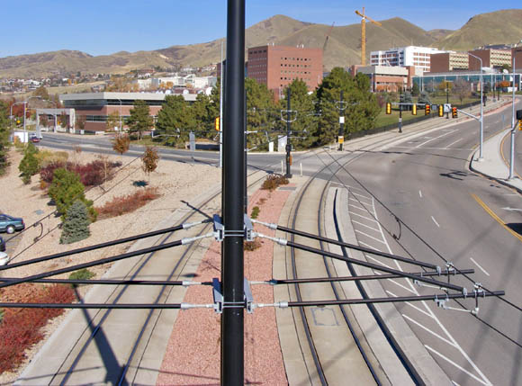 From the pedestrian bridge connecting to Fort Douglas, this view shows the TRAX rails on the farthest section of the University Line. The rails run along the western curb of Wasatch Drive along this stretch.