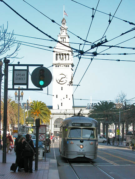 strong sunshine plays on the Ferry Building. This is another scene that presents a study in contrasting