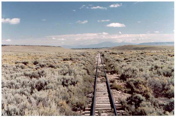This view is near Chama, New Mexico, from the rear platform of the narrow-gauge, historic tourist line to Antonito, Colorado. The sere desert landscape and straight trackage soon give way to mountains and curves, and on this particular day